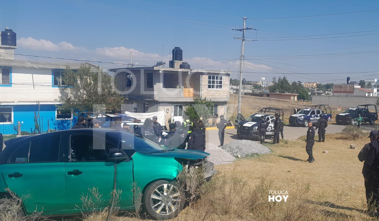VILLA VICTORIA, Edomex.,2 de abril de 2026.-Después de asesinar a balazos a Guillermo, los responsables intentaron huir en un vehículo; sin embargo, chocaron contra una patrulla y dispararon contra dos policías municipales, uno de ellos, falleció en el hospital. Juan Manuel y Juan Carlos viajaban en una unidad Nissan March