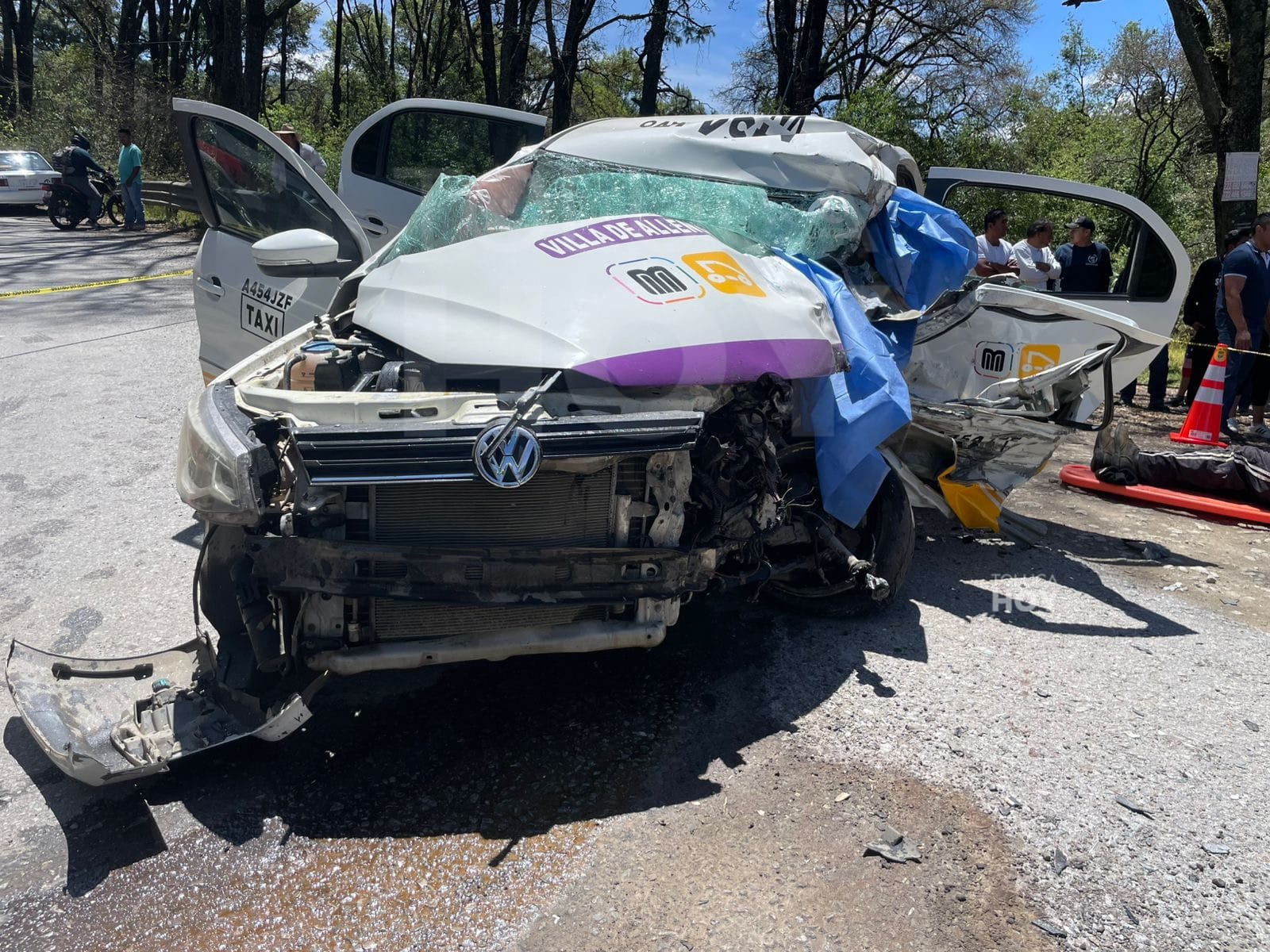 VILLA VICTORIA, Edomex.,6 de abril de 2026.-Mario y Nicolás, fallecieron, luego de que el taxi en el que viajaban chocará de manera frontal contra una camioneta en la comunidad de Dolores Vaquerías, familiares llegaron para identificar a las víctimas en el sitio. Los hombres de 55 y 45 años, circulaban