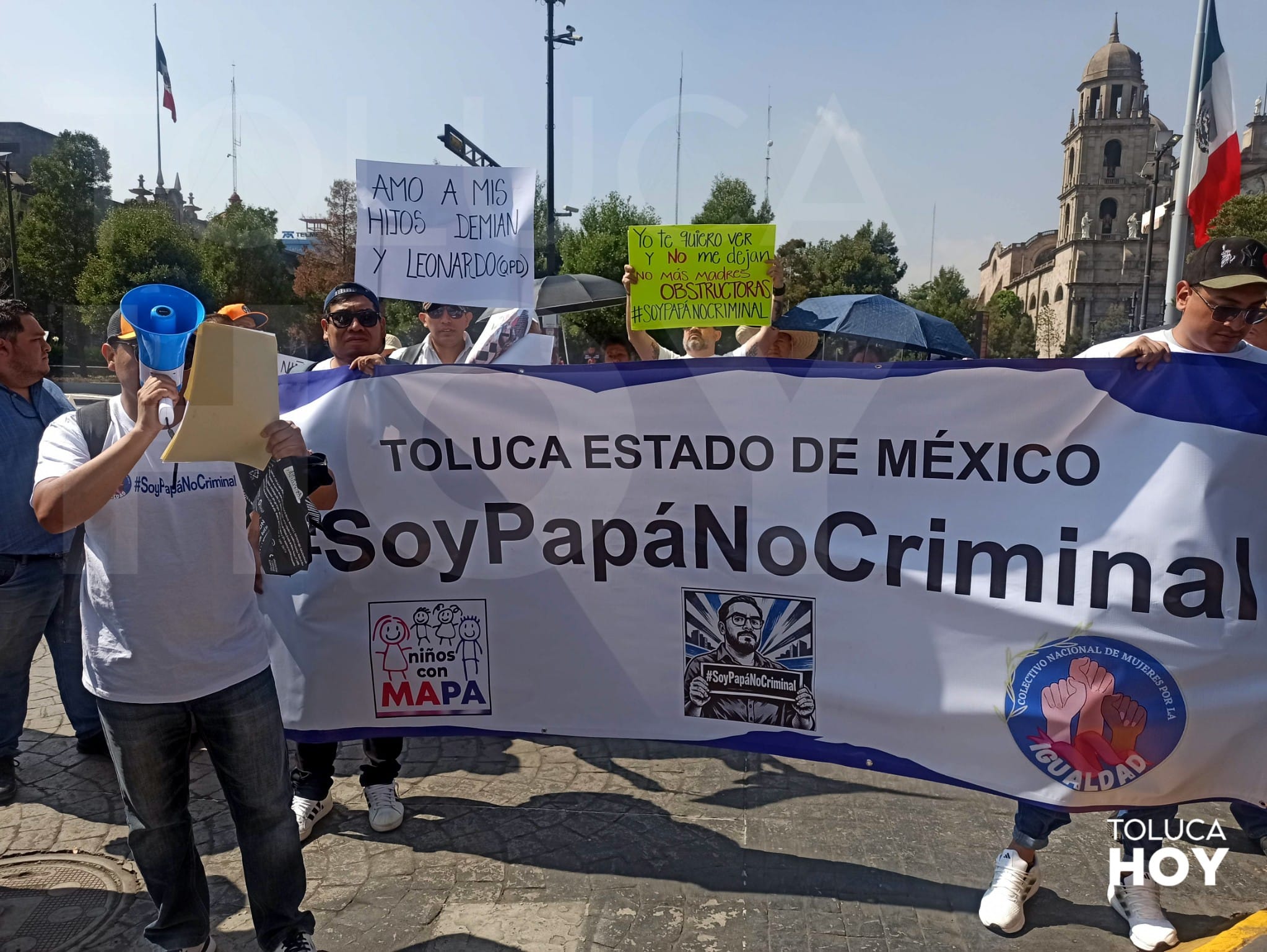 TOLUCA, Edomex; 24 de abril de 2026.- Al señalar ser víctimas de leyes misándricas, padres mexiquenses se manifestaron para pedir justicia y procesos judiciales familiares igualitarios que les permitan tener convivencia con sus hijos o hijas; así como la posibilidad de obtener sus custodias. “Criminalizan a los padres varones por