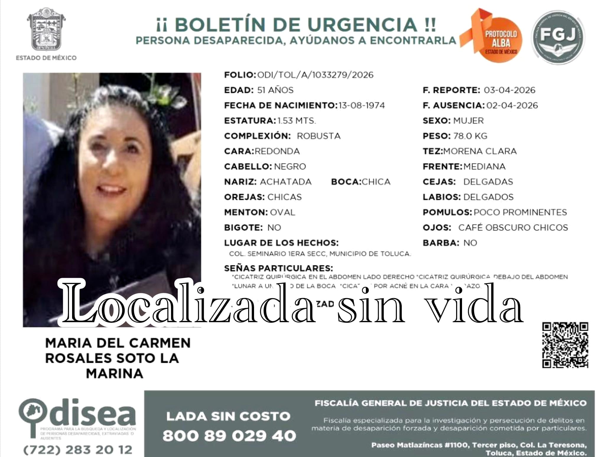 TOLUCA, Edomex.,6 de abril de 2026.-Luego de haber sido reportada como desaparecida, María del Carmen fue encontrada sin vida, tres días después en el departamento que estaba rentando, en la colonia El Seminario Cuarta Sección, no presentaba huellas de violencia. A ella, la vieron por última vez, el pasado jueves,