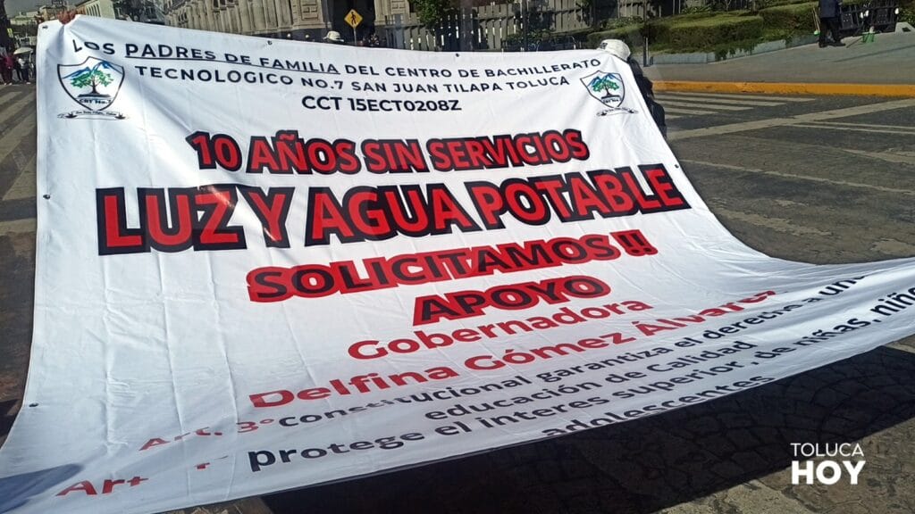 Asimismo, padres de familia de estudiantes del CBT 7 que se ubica en San Juan Tilapa en Toluca para exigir la instalación del servicio de electricidad del que carecen desde hace 10 años y limita la formación académica de sus hijos.