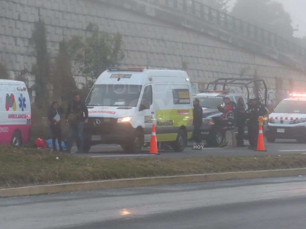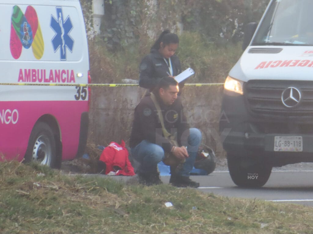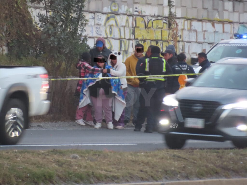 Personal de auxilio vial colocaron conos para advertir del accidente, la circulación en dirección a Metepec se vio afectada, tres mujeres se abrazaban y lloraban frente a los restos que fueron cubiertos con una tela azul.