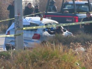 TOLUCA, Edomex.,8 de enero de 2025.-En los asientos traseros de un vehículo, en el que dejaron un mensaje intimidatorio en el cofre, Karla Hillary fue