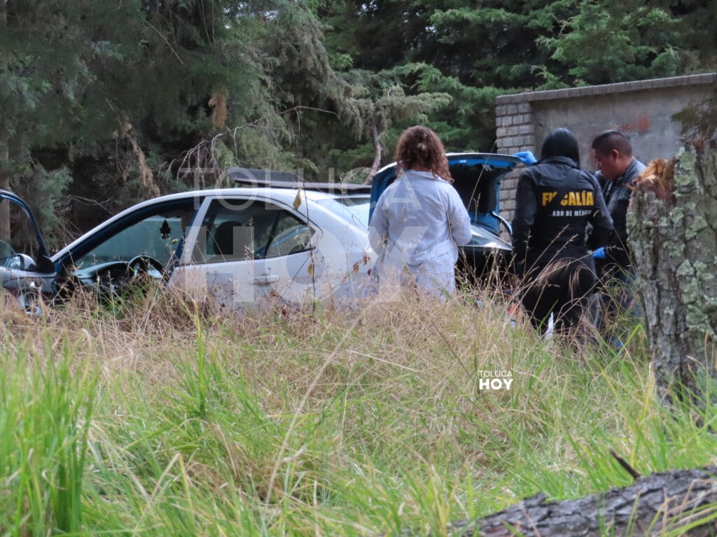 ZINACANTEPEC, Edomex.,6 de febrero de 2026.-Al interior de la cajuela de un taxi, abandonado sobre un camino de terracería de una zona boscosa, un hombre fue hallado con golpes y estrangulado en la comunidad de La Huerta, la víctima no pudo ser identificada.