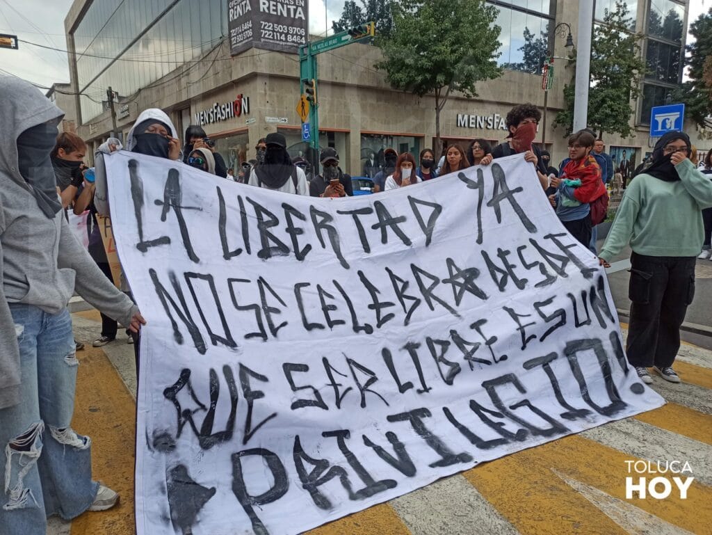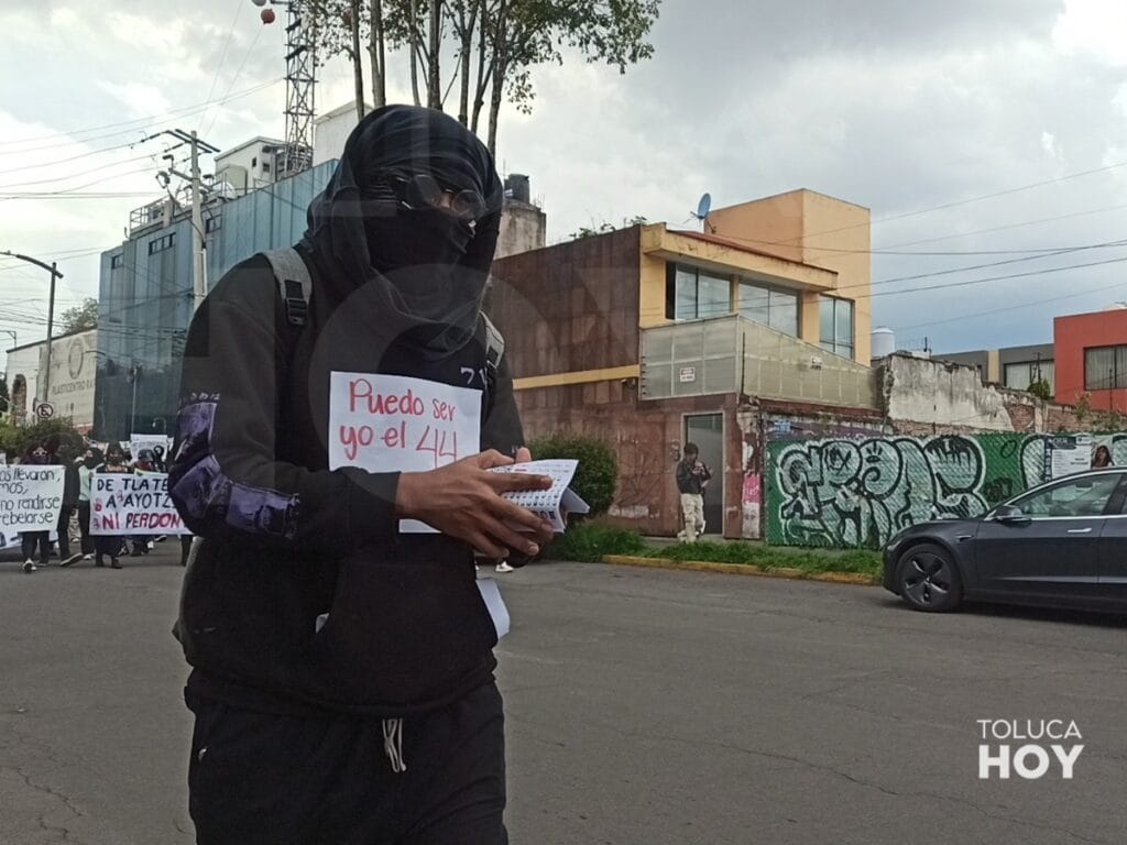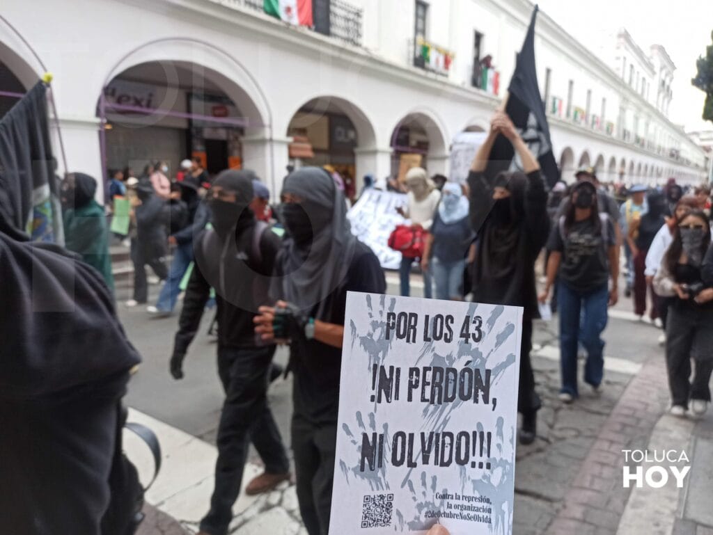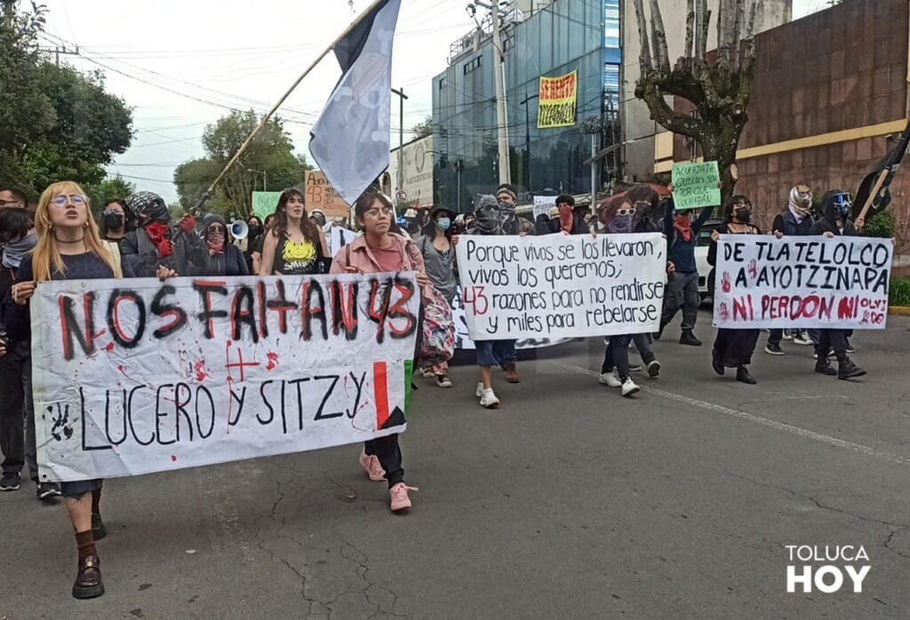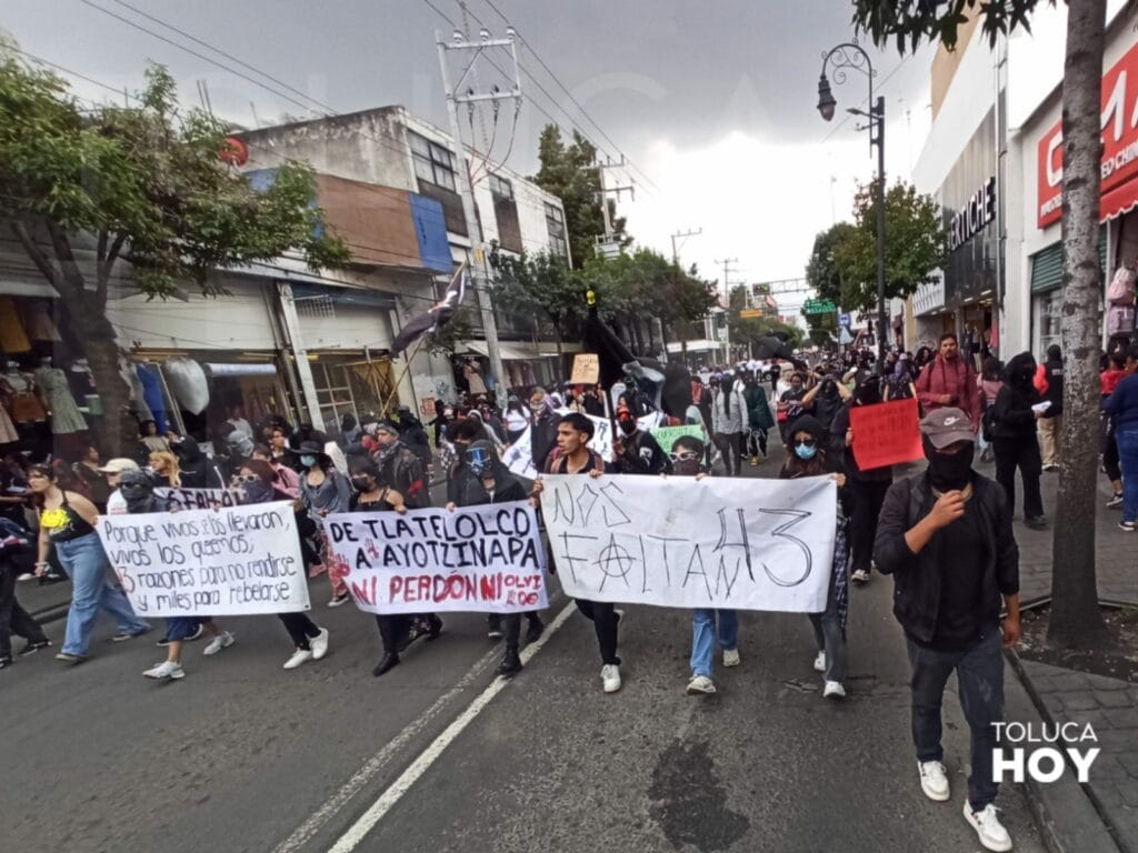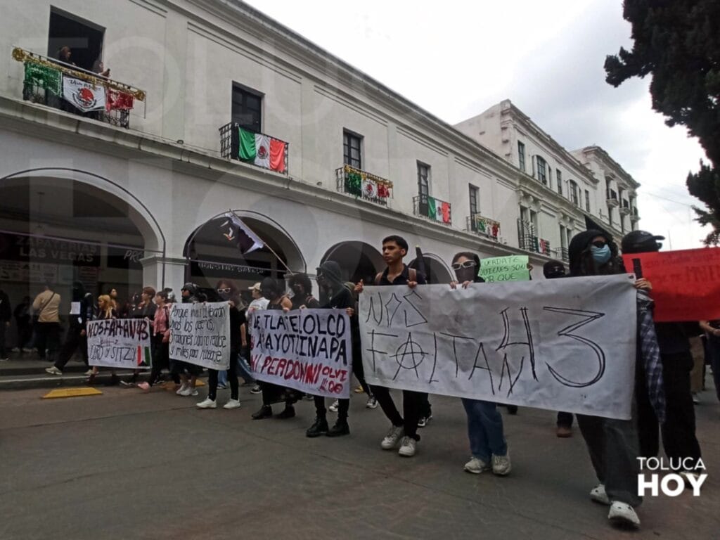 TOLUCA, Edomex; 26 de septiembre de 2025.- A 11 años de la desaparición de 43 estudiantes de la Normal Rural de Ayotzinapa colectivos y estudiantes en Toluca salieron a marchar para exigir justicia. A pesar del tiempo del caso, no de han esclarecido los hechos.