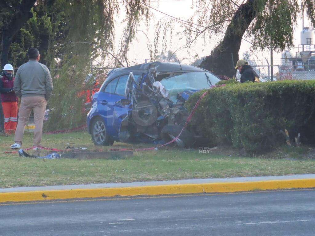 La madre de tres hijos, circulaba a bordo de un Nissan March color azul que terminó destrozado de la parte delantera del lado del copiloto después de la colisión en la carretera Toluca Tenango del Valle cruce con Uruapan.