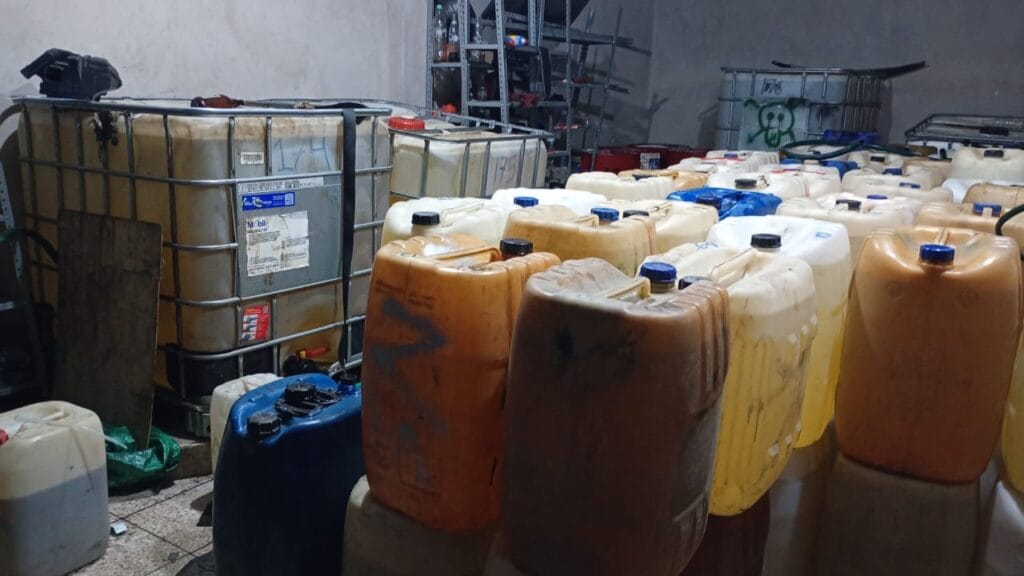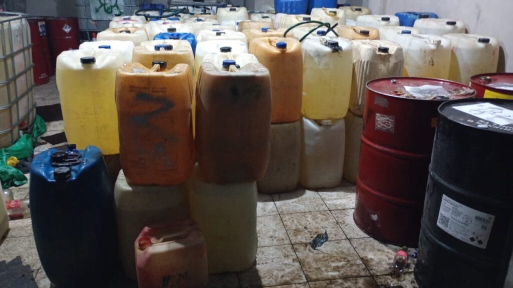ALMOLOYA DE JUÁREZ, Edomex.,13 de marzo de 2026.-Una bodega con miles de litros de hidrocarburo fue ubicada a pie de la carretera, aunque no hubo reportes de detenidos en la comunidad de San Pedro la Hortaliza, todo a raíz de una llamada anónima.
