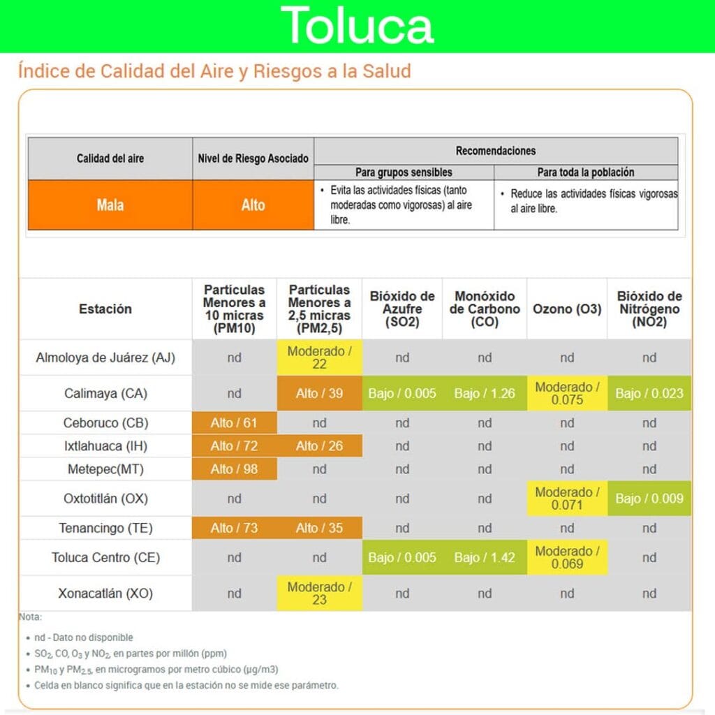 TOLUCA, Edomex; 19 de febrero de 2026.- A pesar de ser la temporada seca-cálida en la que mayores concentraciones de contaminantes hay en la atmósfera, en la zona metropolitana del Valle de Toluca las estaciones de medición no funcionan o no difunden los datos; y a su vez no se decretan las contingencias ambientales para alertar a la población y que cuiden su salud, reprocharon activistas.