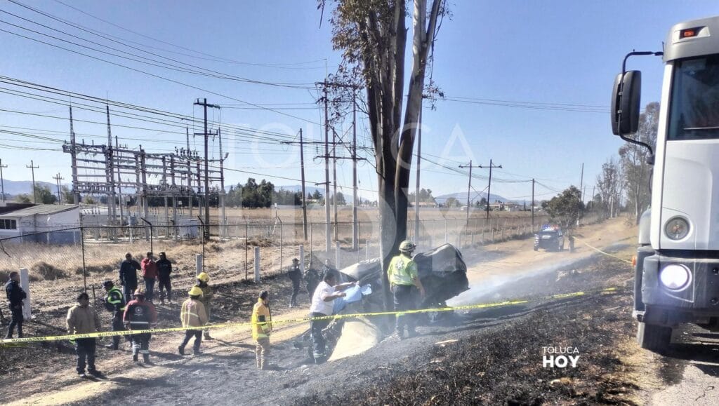 JOCOTITLÁN, Edomex.,24 de febrero de 2026.-Dos tripulantes que no pudieron ser identificados fallecieron calcinados, luego de que el vehículo en el que viajaban salió de la carretera, hasta impactarse con un árbol y fuera consumido por el fuego a la altura de Pastejé.