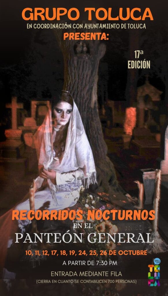 TOLUCA, Edomex; 3 de octubre de 2025.- La 17ª Edición de los Recorridos Nocturnos en el Panteón General contará este 2025 con nueve fechas para que más personas puedan disfrutar de las leyendas escenificadas que ya alista Grupo Toluca. Se llevarán a acabo durante tres fines de semana, los días