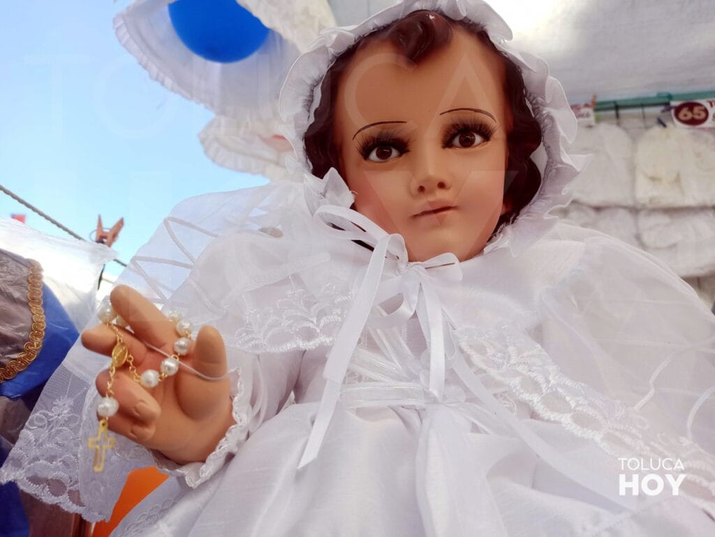 TOLUCA, Edomex; 29 de enero de 2026.- Vestimenta de partidos de fútbol y personajes ya no son tan buscados por las familias para vestir a sus Niños Dios. Los ropones de colores claros y ropa de bebé son los que más buscan, indicó María del Carmen de la Cruz, comerciante