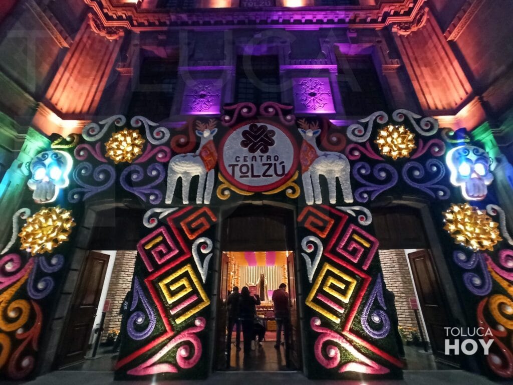TOLUCA, Edomex; 10 de octubre de 2025.- Una tradicional portada con cerca de 35 mil flores de papel, así como elementos tradicionales mexicanos y toluqueños como la flor de cempasúchil, calaveras y un borreguito de Alfeñique, da la bienvenida a la tradicional Ofrenda de Muertos de Centro Tolzú.