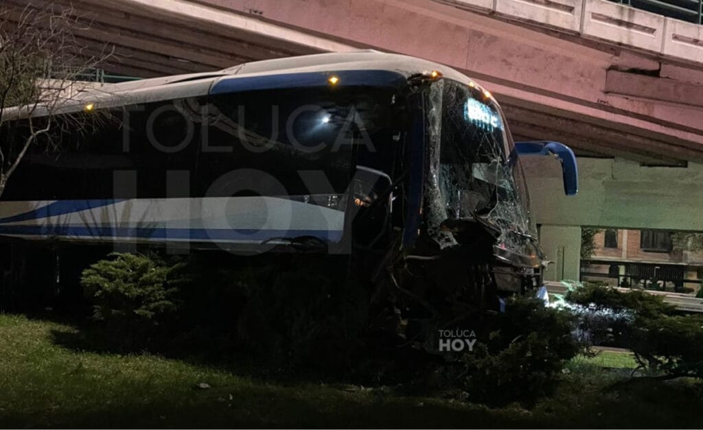 TOLUCA, Edomex.,17 de abril de 2026.-Luego de accidentarse un autobús de pasajeros, el cuerpo de un hombre terminó deshecho, la unidad habría chocado con el muro de contención y árboles hasta acabar en el camellón en la delegación de Santa Ana Tlapaltitlán.