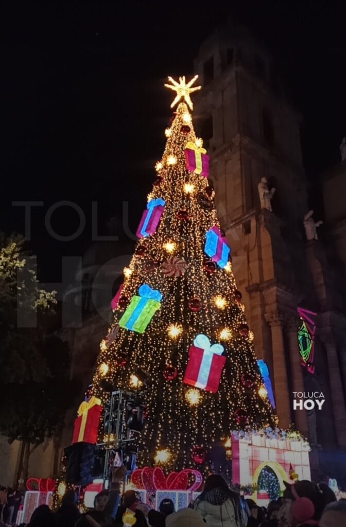 TOLUCA, Edomex; 1 de diciembre de 2025.- El árbol de Navidad monumental que adornará la capital del Estado de México para las celebraciones decembrinas se encendió. Con una altura de 28 metros atrajo a más de 3 mil familias para el arranque de la temporada.