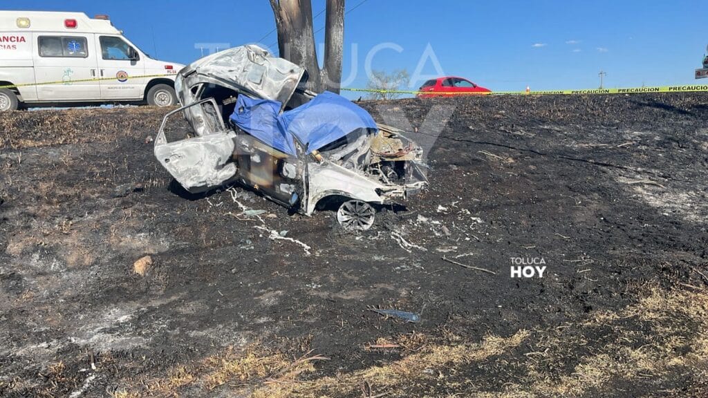 Mueren 2 calcinados al chocar contra árbol en la Toluca Atlacomulco